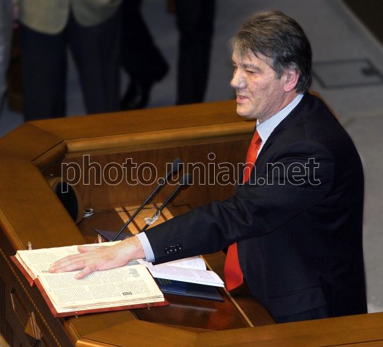 Ukraine's key opposition leader Viktor Yushchenko takes a symbolic oath of office, his left hand on the Bible, his right one on the Constitution, and declares victory in the country's presidential elections, during a parliament session in Kiev Tuesday, Nov. 23, 2004.