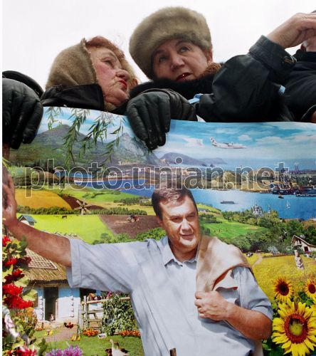 Supporters of Ukrainian presidential contender Viktor Yanukovich hold a post with his portrait at the meeting in his support in Sevastopol on Tuesday, December 14, 2004. Mr. Yanukovich goes for a pre-election trip to regions before the overvoting of the second round of presidential elections. Photo by Sergey Svetlitsky / UNIAN