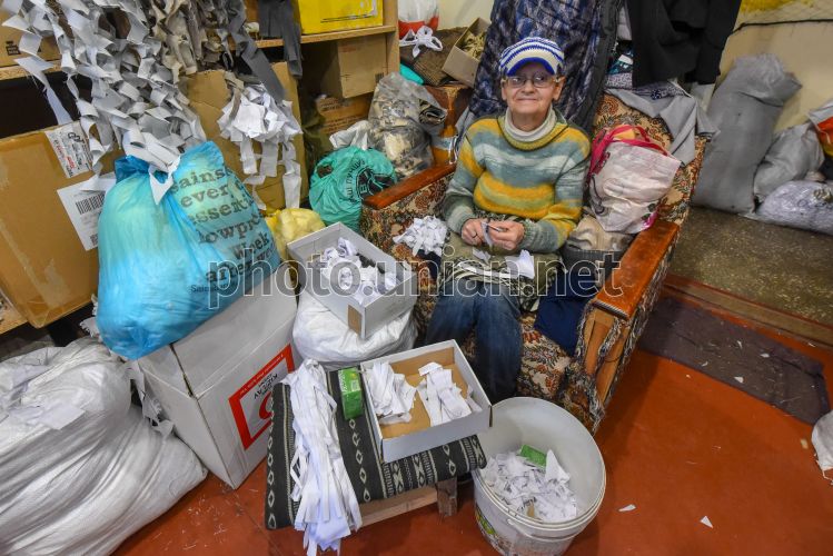 Volunteers weaving a camouflage net in Zaporizhzhia