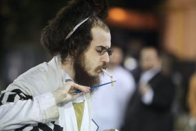 An elderly man rolls a loaded shopping cart in the center of Kyiv