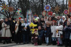Participants of the Christmas procession pass by the makeshift memorial "Lawn of National Memory" in Kyiv