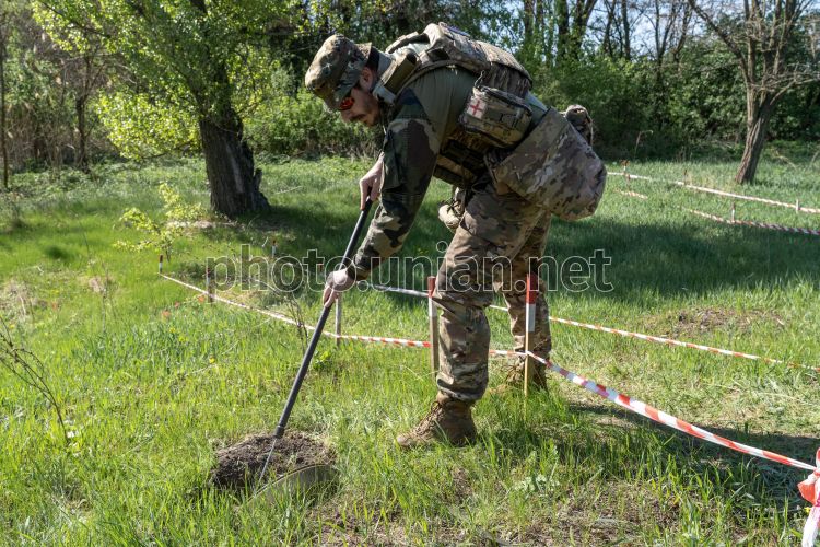 A policeman from the explosives squad of the National Police of Ukraine checks the area for mines and booby traps