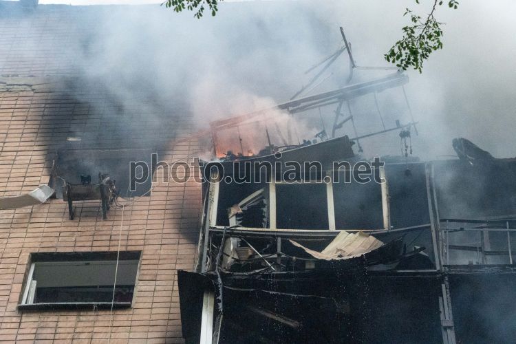 Municipal service employees near a house damaged in a massive combined attack on Kharkiv