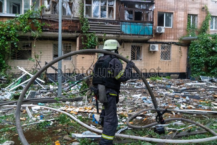 Municipal service employees near a house damaged in a massive combined attack on Kharkiv