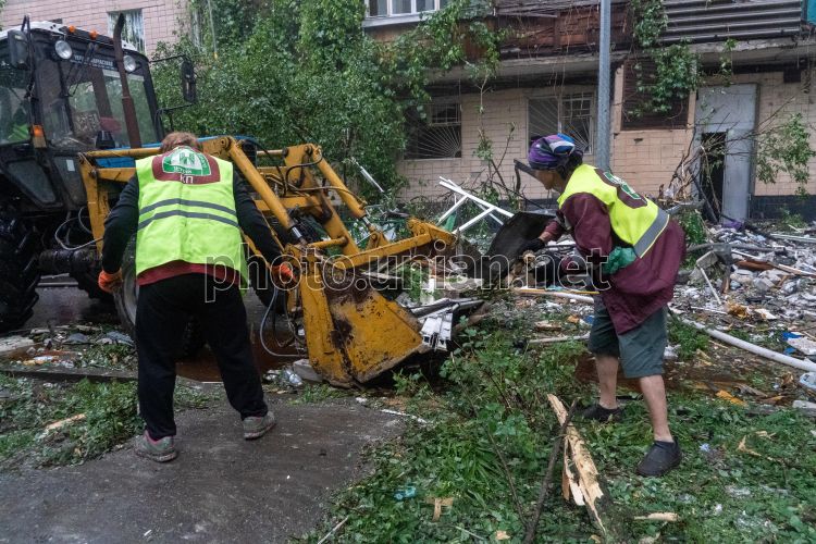 Municipal service employees near a house damaged in a massive combined attack on Kharkiv