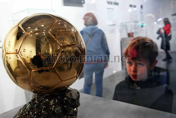 A boy looks at the UEFA Cup (held by FC Shakhtar Donetsk)