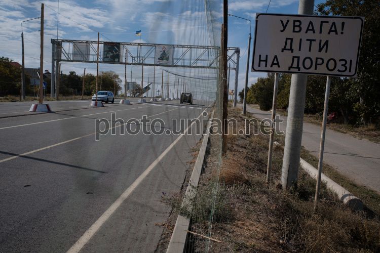 Anti-drone nets over a road in Kherson