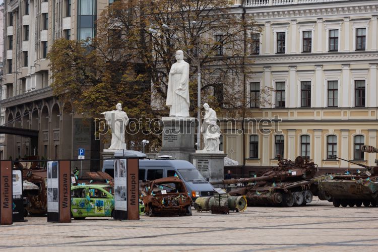 Destroyed Russian military equipment on Mikhailovskaya Square