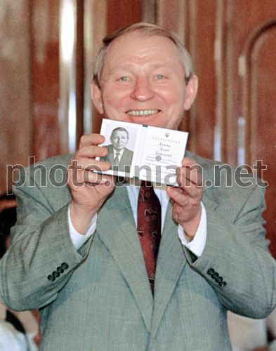 UNIAN ARCHIVE - Leonid Kuchma, the President of Ukraine, demonstrates his just received presidential mandate in this July 10, 1994, file photo in Kiev, capital of Ukraine. As a result of the Sunday Nov.14 second round of the presidential elections Leonid Kuchma was elected the Ukraine's president for the second five year term.