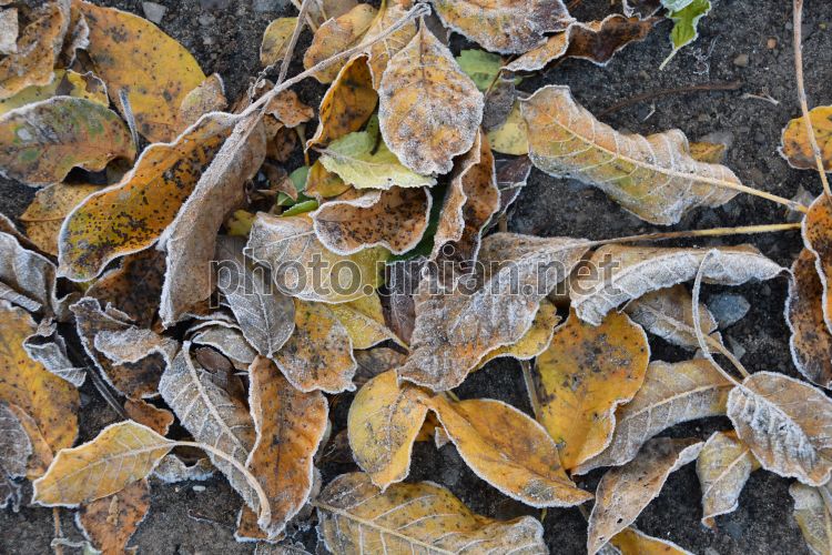 Frost-covered walnut leaves on the ground in Lviv