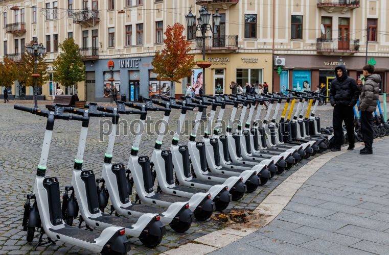 Pizza delivery service courier on a bicycle on the street in Kyiv