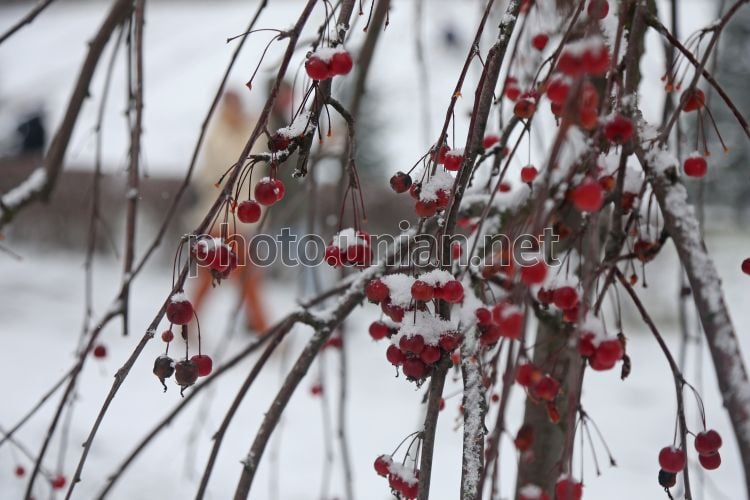 Snow-covered paradise apples on tree branches in a park in Kiev