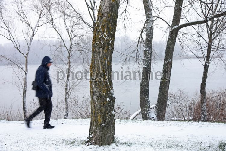 A municipal worker clears snow from a sidewalk on a street in Kyiv