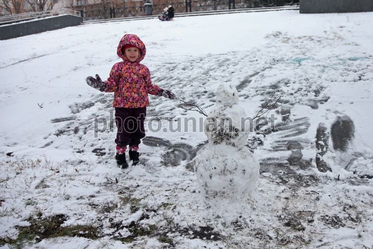A woman and a girl take a selfie on a snowy street in Kyiv
