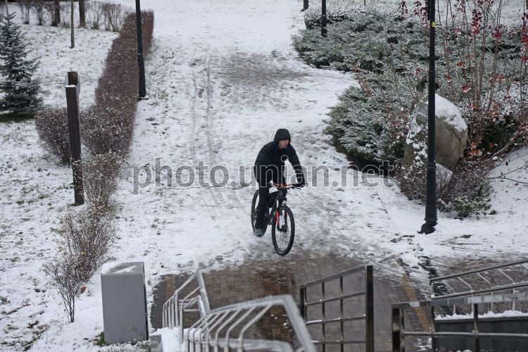 A municipal worker clears snow from a sidewalk on a street in Kyiv