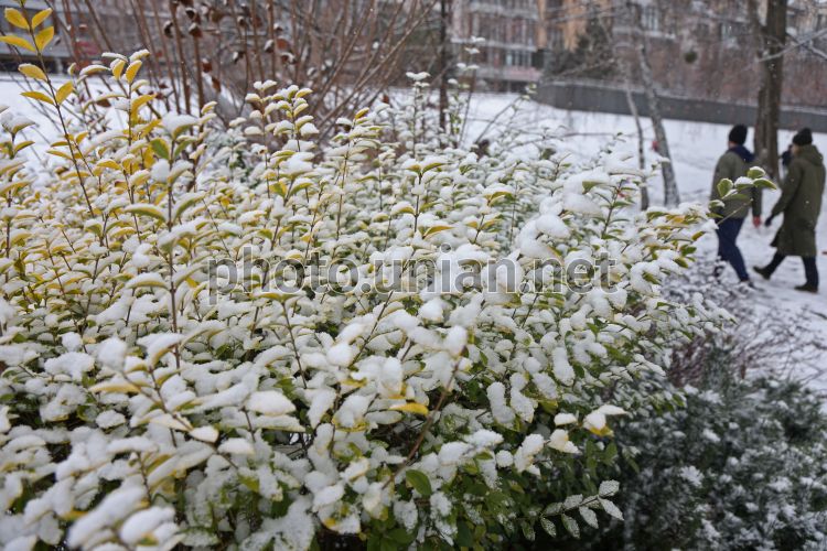 Snow-covered bush in a park in Kiev
