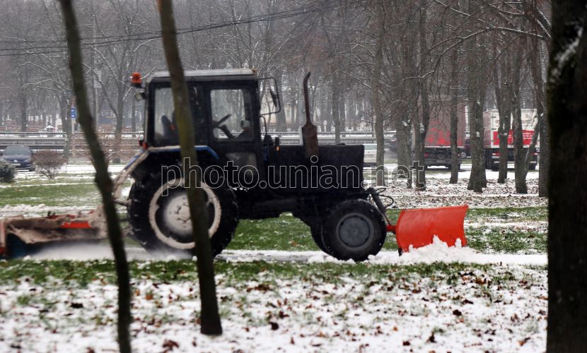 A municipal worker clears snow from a sidewalk on a street in Kyiv