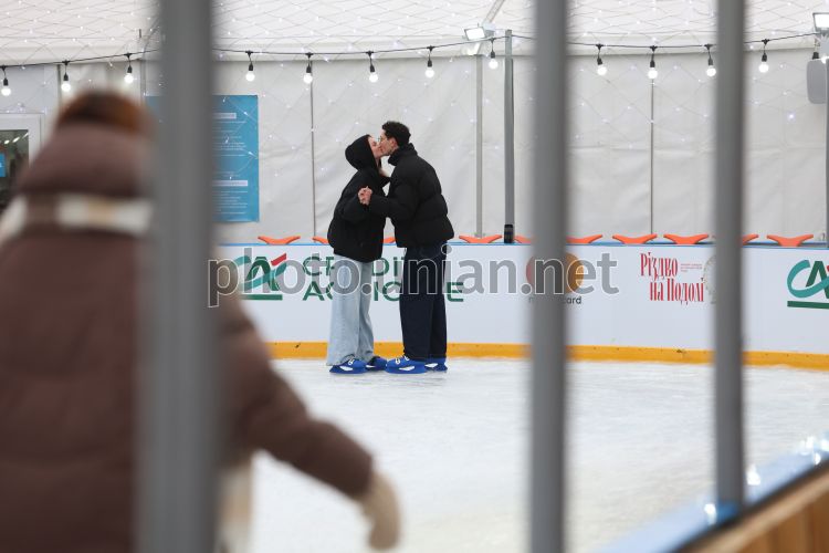 A girl wearing a hoop with deer antlers crosses the street in Kyiv