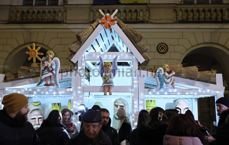A man dressed as St. Nicholas stands near Lviv's main New Year's tree.