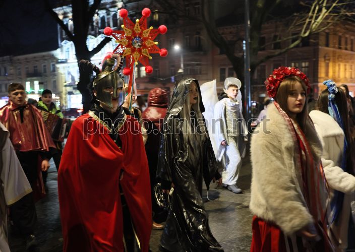 A man dressed as St. Nicholas stands near Lviv's main New Year's tree.