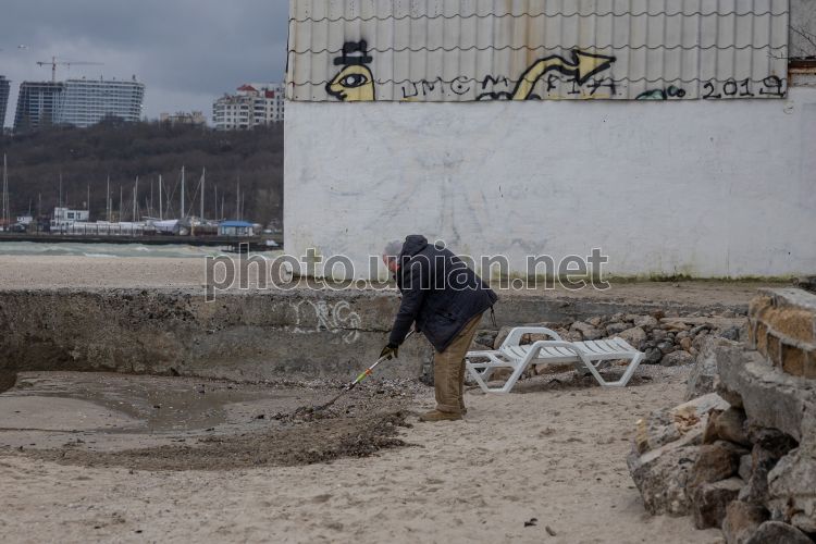 Environmentalists clean up oil slick in the sea off the coast of Odessa