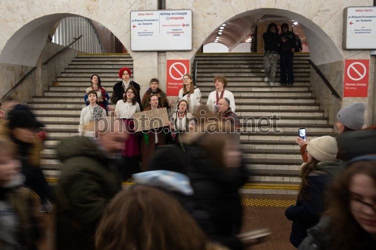 Young people sing carols for the needs of the Azov brigade at the Maidan Nezalezhnosti metro station in Kyiv