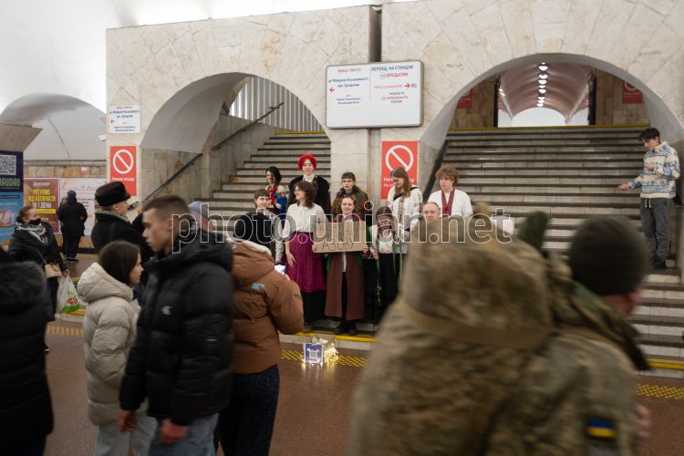 Young people sing carols for the needs of the Azov brigade at the Maidan Nezalezhnosti metro station in Kyiv