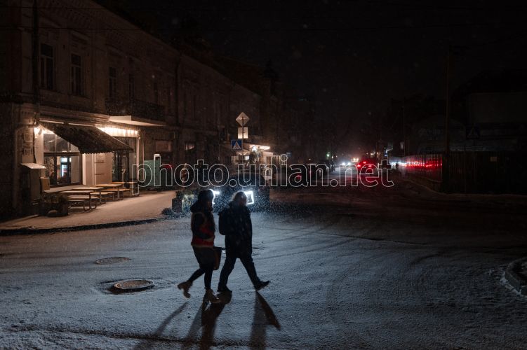 Passersby on a dark street during a blackout in Kyiv