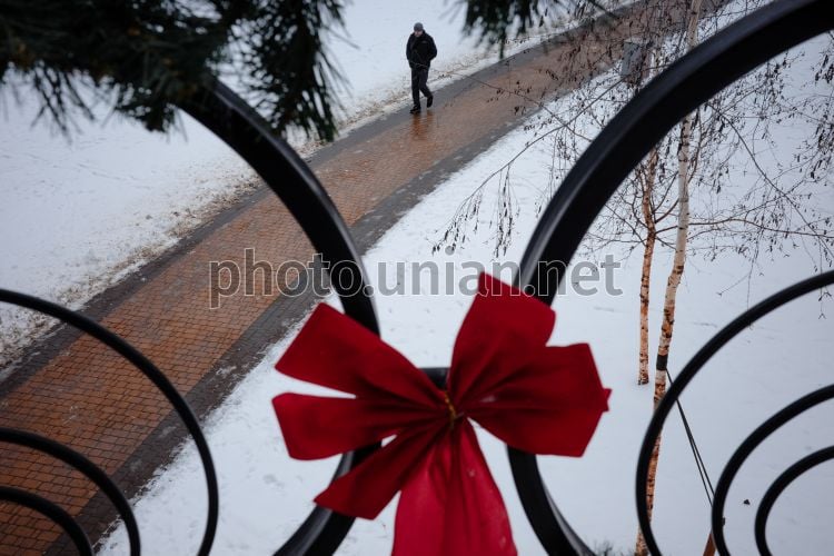Snow-covered paradise apples on tree branches in a park in Kiev