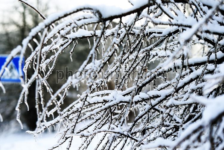 A bell with a yellow and blue ribbon on the icy branches of a tree