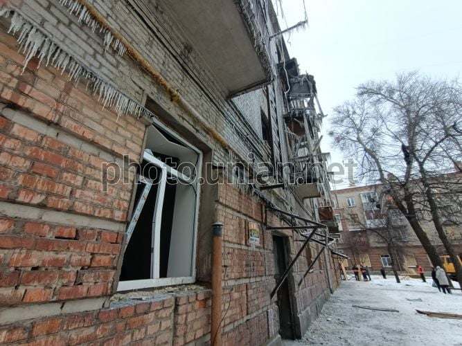 Skewed window frames in a residential building after a UAV attack in Kharkiv