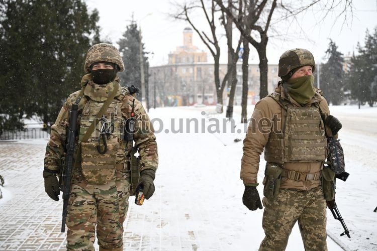 Military personnel patrol the center of the city of Druzhkivka in Donetsk region
