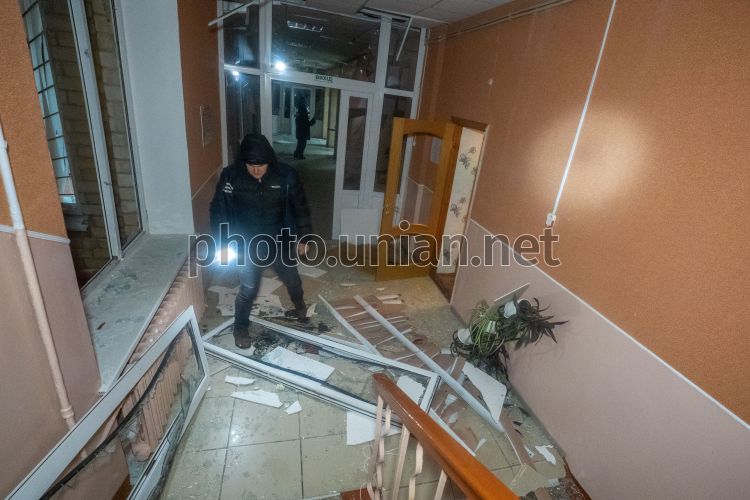 Teachers near a boarding school for gifted children that was damaged by shelling