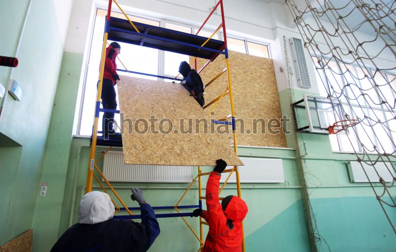 Covering up broken windows in a school gym with plywood after Russian shelling