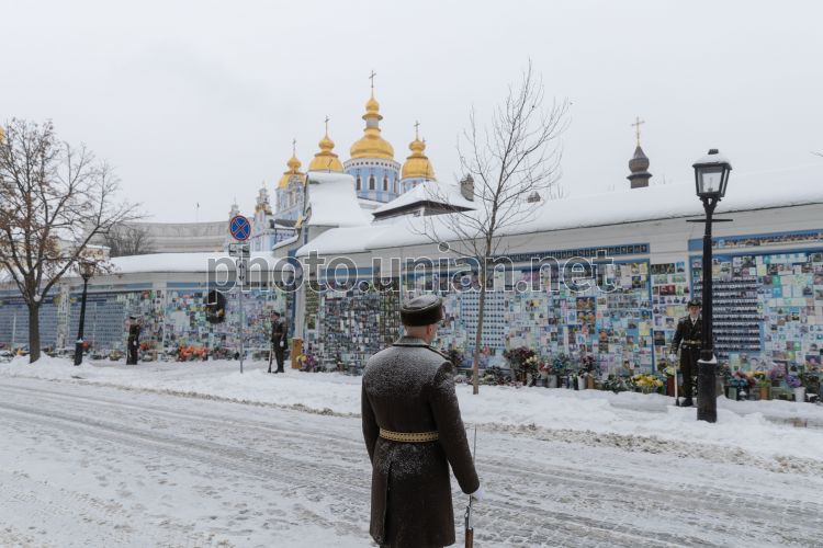 A wreath from the President of Ukraine Volodymyr Zelenskyy at the Wall of Remembrance on Mikhailivska Square in Kyiv