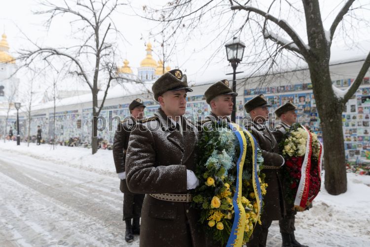 A wreath from the President of Ukraine Volodymyr Zelenskyy at the Wall of Remembrance on Mikhailivska Square in Kyiv