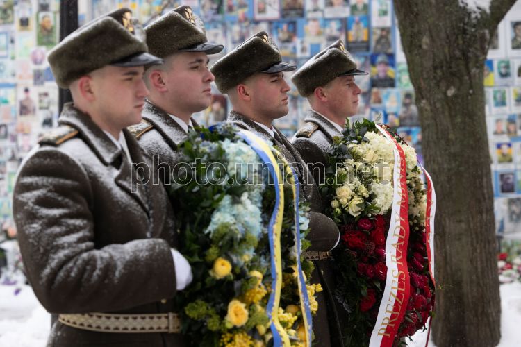 Wreaths from Volodymyr Zelenskyy and Donald Tusk at the Wall of Remembrance on Mykhailivska Square in Kyiv