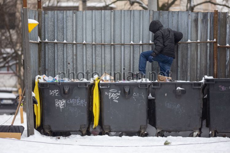 A municipal worker compacts garbage in a garbage container in Kyiv