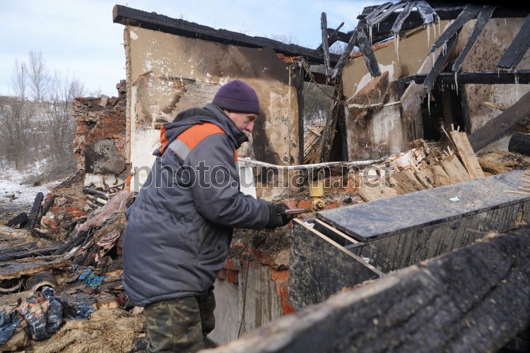 People clear the rubble of a residential building destroyed by a Russian drone strike in Bogodukhiv