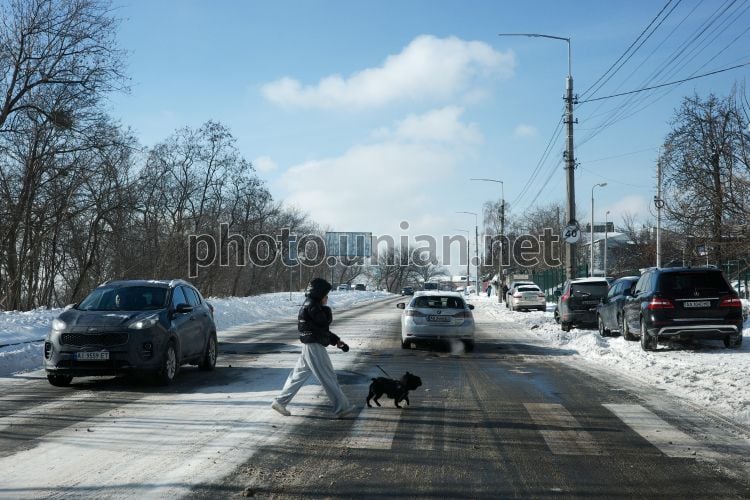 A man is carrying a sled with a child in the background of the Novus supermarket in Kyiv