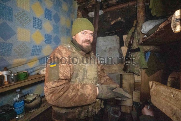Artilleryman in a dugout on the Ukrainian-Russian front line in the Kharkiv region