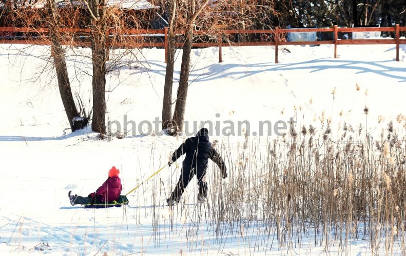 Children sledding in one of the parks in Uzhgorod