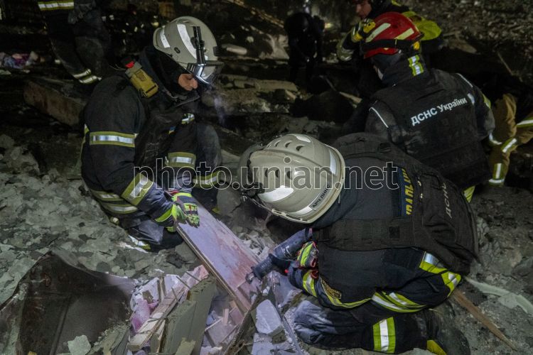 Search and rescue operations at the site of a Russian missile hitting a five-story residential building in the Kyivskyi district of Kharkiv