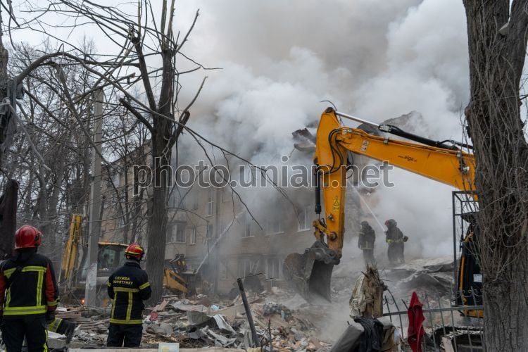 Search and rescue operations at the site of a Russian missile hitting a five-story residential building in the Kyivskyi district of Kharkiv
