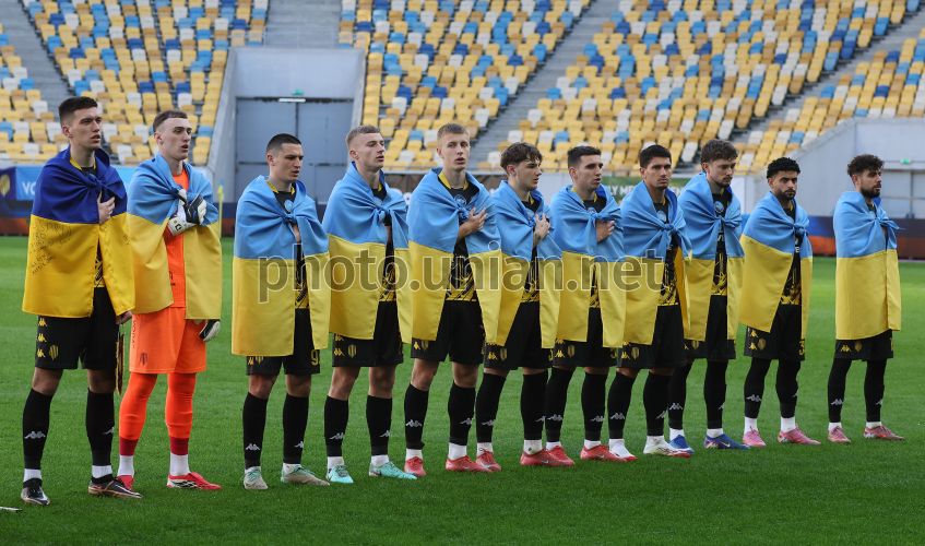 Players of FC Rukh and FC Metalist 1925 hold a poster "Fight - you will win"