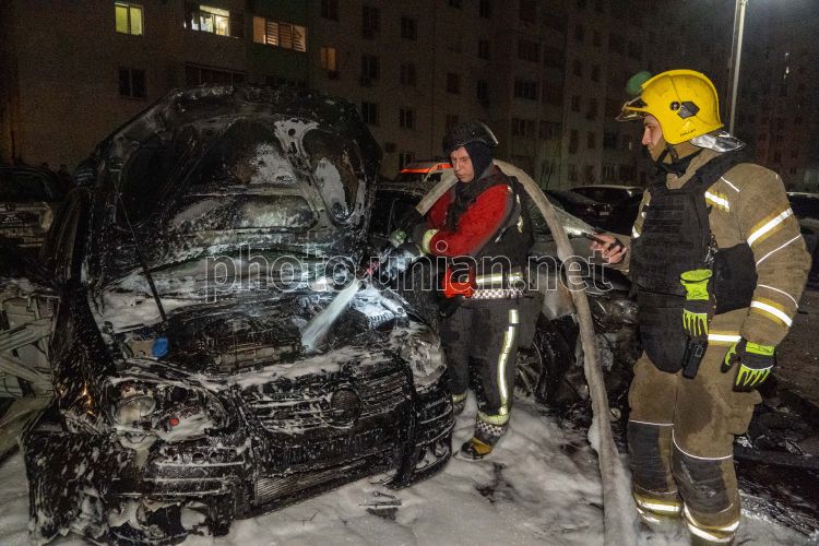 A fire truck near a house and cars damaged by shelling in Kharkiv