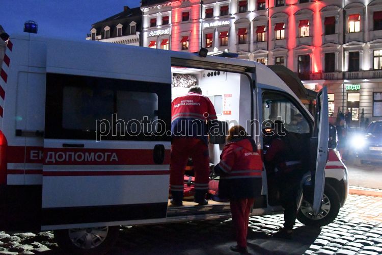 Ambulance doctors provide assistance to people after Russian drone attack in Lviv