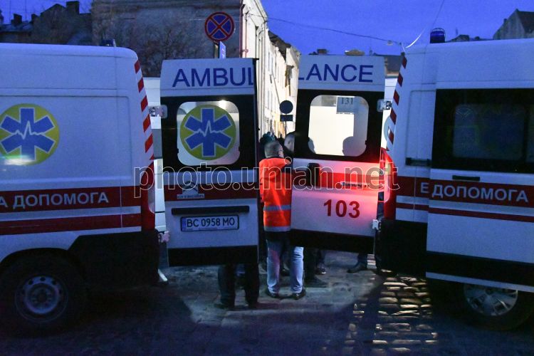 Ambulance doctors provide assistance to people after Russian drone attack in Lviv