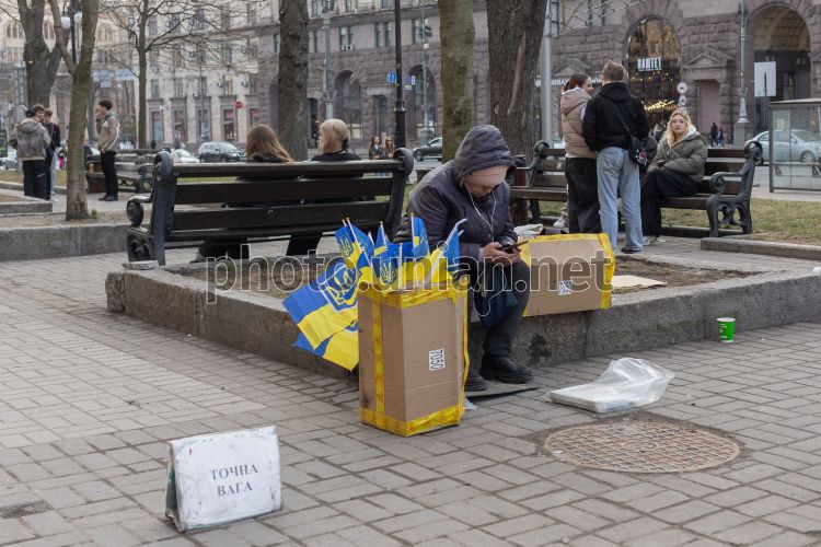 A man sells Ukrainian flags in the center of Kyiv