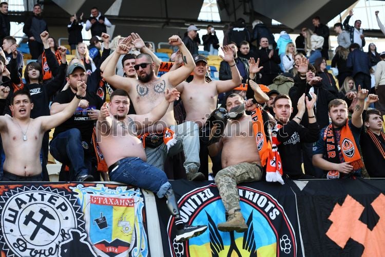 Fans of FC Shakhtar (Donetsk), including veterans, in the stands